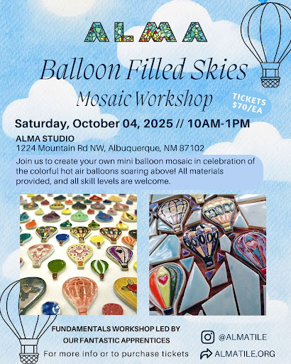 Design and create your own balloon themed personal mosaic. Participants will make a mosaic using ALMA’s handmade tile stock collection and themed tiles. You will also learn how to install and grout a personal mosaic that you will take home with you. Come solo, make it a friend outing or a great date idea.